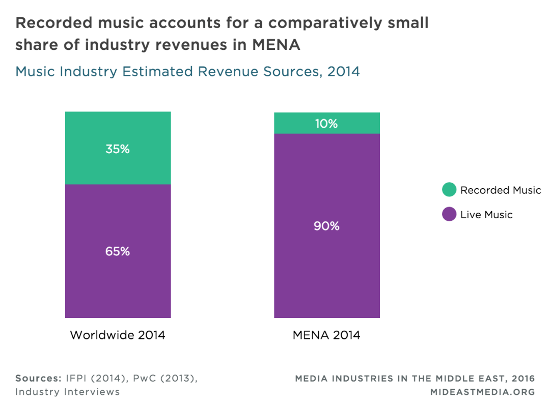 鉴于盗版率极高的影响,加之2018年以前的大环境问题,已有成熟运作模式的主要国际数字流媒体平台回避中东地区,收入得不到保障的音乐人和唱片公司也从2014年开始将重心放在现场演出,且依赖程度远超其他国家地区。一般来说,在全球,四分之一的音乐现场表演收入是来自于赞助商,但在中东,拥有赞助商的演出却不足10%,这也使得中东音乐人极度依赖门票收入。