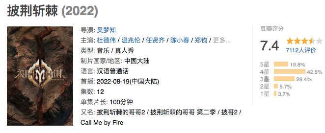 但好在《披哥2》的口碑尚在。虽然节目依旧存在不少问题,但舞美升级、“哥哥”们实打实地全开麦、视觉盛宴都明显优于其他选秀节目。这也是其目前在豆瓣上拿下7.4分的关键。