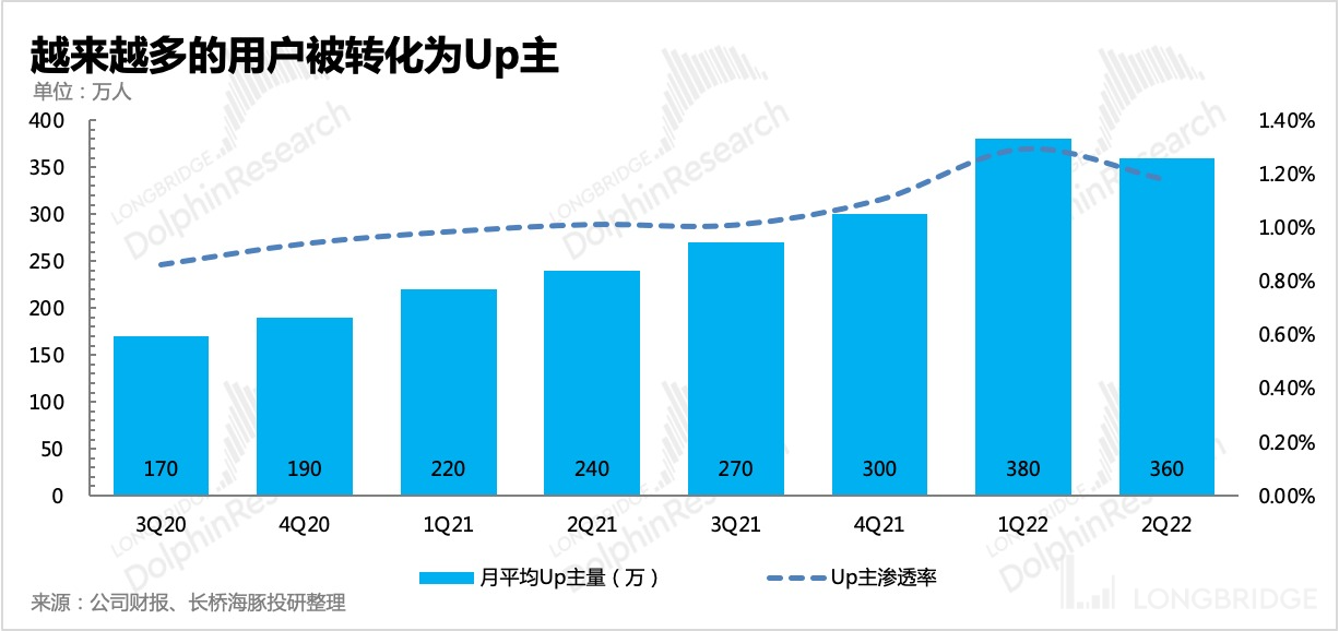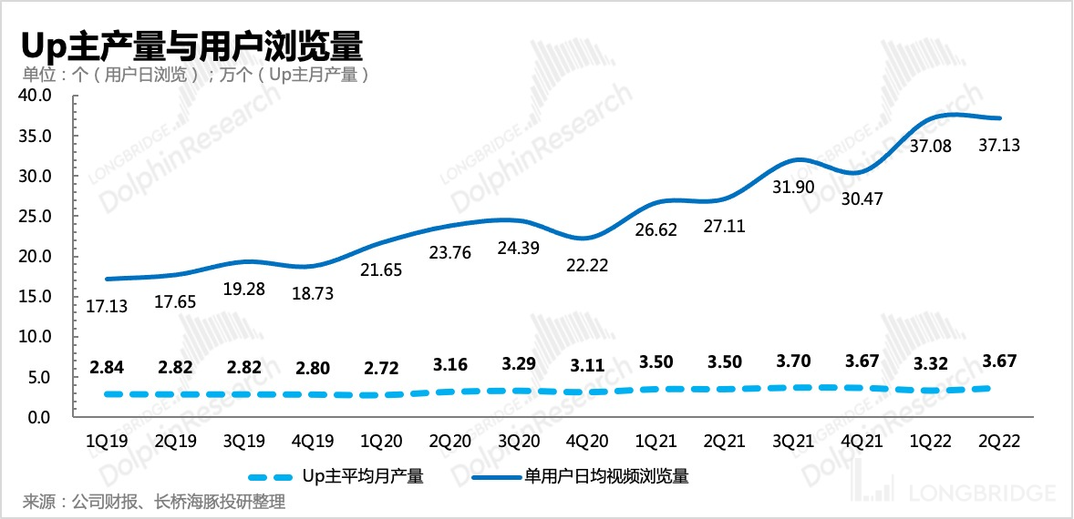 二季度月活跃 Up 主数量从一季度的 380 万降至 360 万,是 B 站 Up 主数量首次下滑。尾部小 Up 主减少活跃后,单个 Up 主的产量也被 “提纯”,体现了更多头部、中腰部的 Up 主实际视频生产能力。