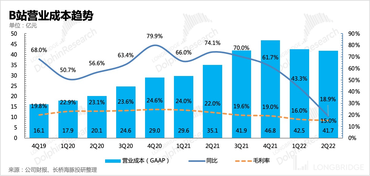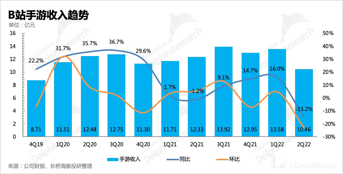 整个上半年 B 站没有优质新游上线,行业上也缺少新的爆款手游,联运收入也受到影响。因此二季度游戏收入下滑明显,同比减少 15%。
