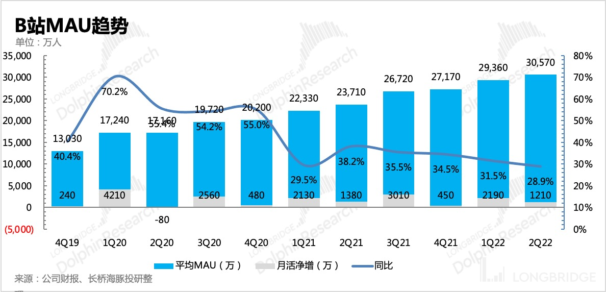 二季度 B 站的用户净增 1210 万,整体月活(App、PC、电视等)突破 3 亿达到 3.06 亿人,同比增长 28.9%,基本符合公司的指引和市场预期。