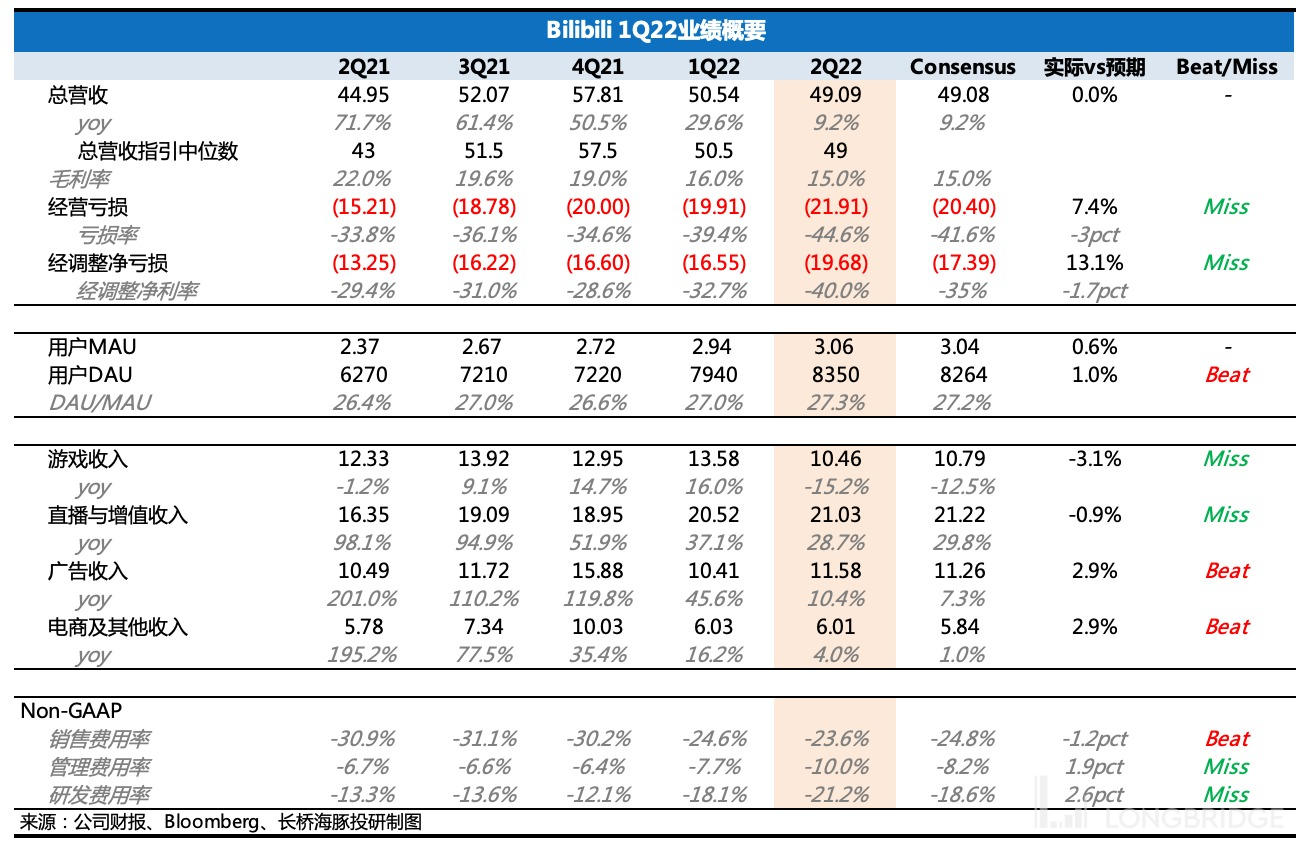北京时间 6 月 9 日港股盘后,哔哩哔哩(BILI.O/9626.HK)发布了 2022 年二季度业绩。实际上,二季度的宏观环境、同行表现以及公司自身的指引,都相对明确的引导了市场预期。再加上在一众互联网标的中,B 站的降本增效节奏最慢,二季度才有游戏研发的大规模裁员新闻,因此要在财务指标上看到效果至少得等到三季度。