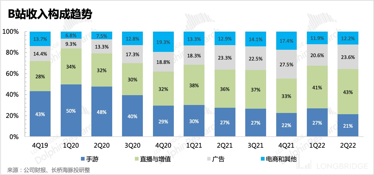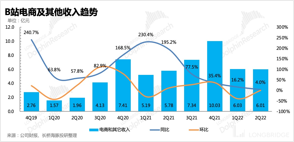 B 站的自营电商主要靠的是死忠粉、二次元核心用户,这一块对整体营收的贡献并不大。二季度主要受到疫情影响,昆山仓库物流供应链受阻,从而压制了自营电商的表现,下半年有望复苏,但与去年相比,今年的增速显然会受到消费力下滑的影响。