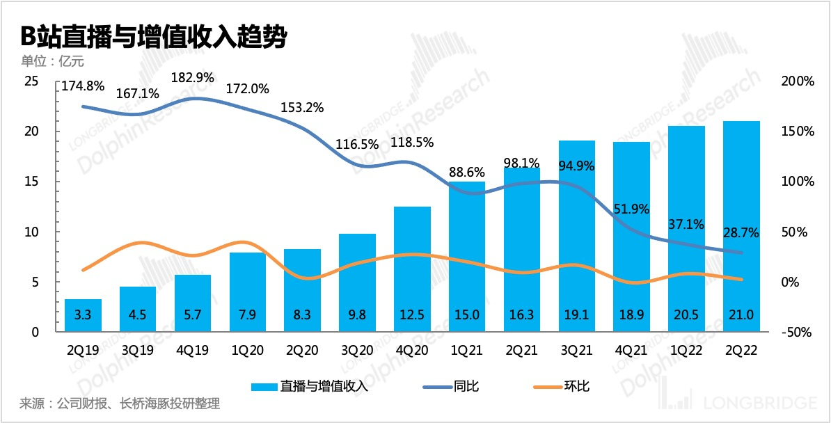 二季度直播增值收入 21 亿元,同比增长 29%,相对稳态。从大会员数量虽然增长不错,但这里面有 100 万份免费赠送的水分。实际上,应该还是主要依靠直播的增长。电话会中,管理层也提及,主播人数同比翻倍,直播用户的渗透率也在提升。