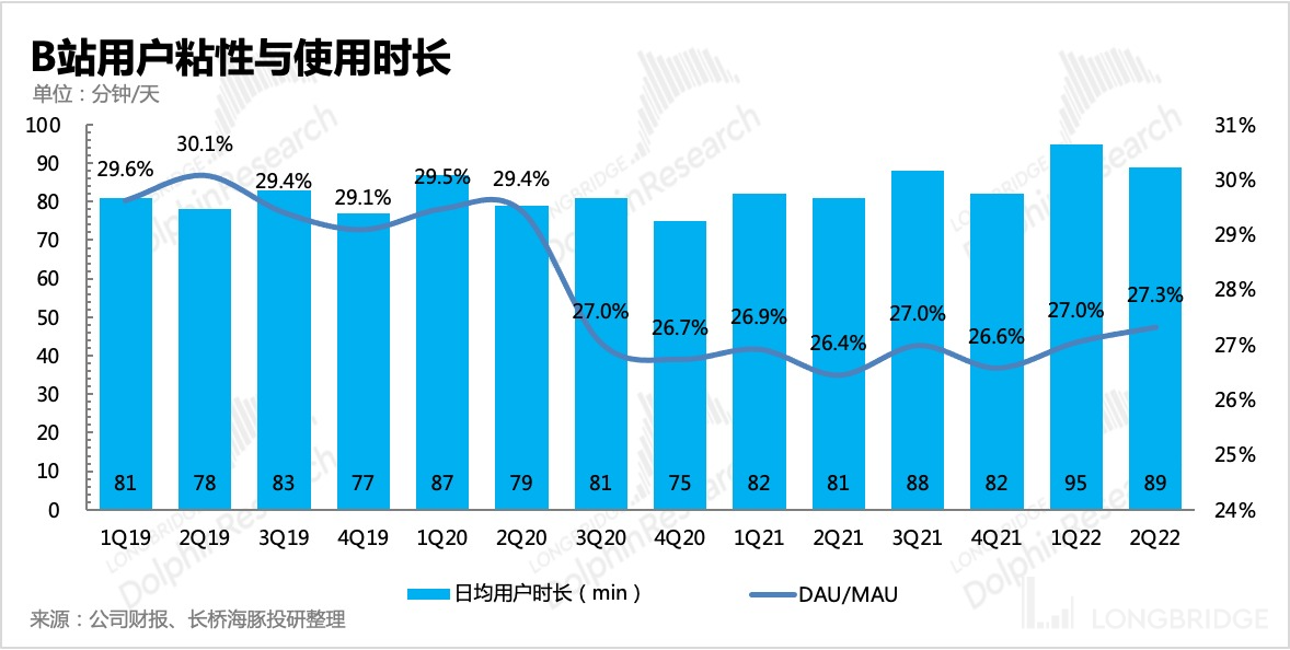 体现用户粘性的指标 DAU/MAU 环比提升至 27.3%,日均用户时长为 89 分钟,比一季度的 95 分钟有所下降,淡季效应显著。