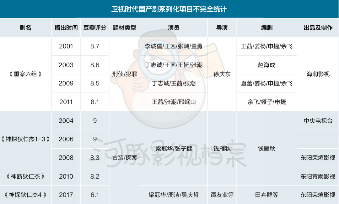 往前追溯会发现,早在卫视时代,国产剧就对系列化多有尝试,有些作品已被如今的观众视为经典,但其中包含时代滤镜的成分。《神探狄仁杰》也存在版权问题,导演和制片人分道扬镳之后,分别推出了两版第四部,一部改名为《神断狄仁杰》,另一部于2017年才姗姗来迟,但质量明显下降;《重案六组》系列的主演中,只有饰演季洁的王茜做到了常驻。