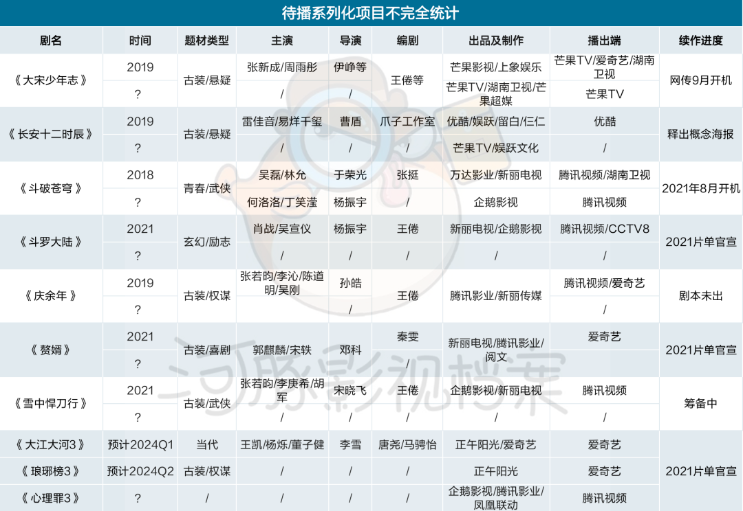 还有部分系列让观众陷入漫无边际的等待。《庆余年》《大宋少年志》都播出于2019年,但第二季都迟迟未开机,前者还处于剧本阶段,#李小冉说庆余年2剧本还没出来#于昨日登上热搜,后者的最新进展则是网传将于9月开机。