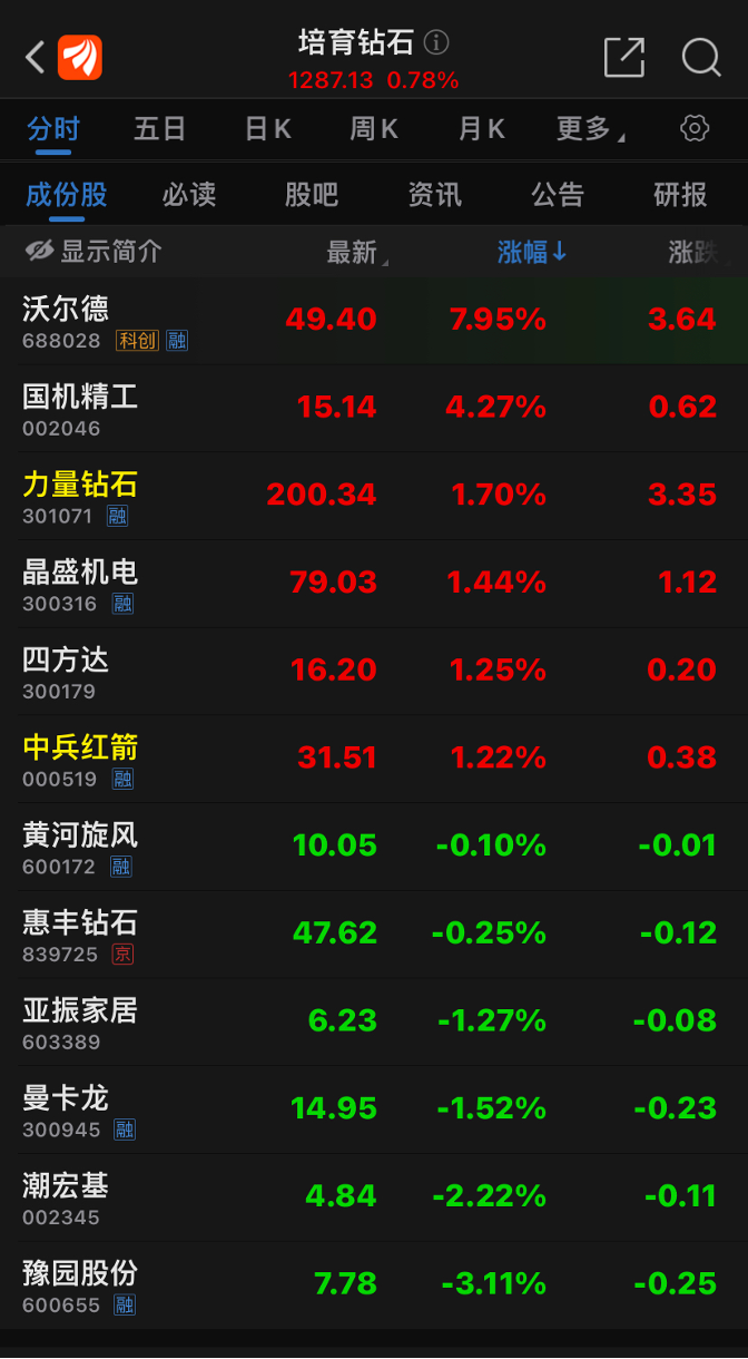 同期,持有培育钻石概念股的机构快速增加。基金二季度持股公告统计显示,有8只培育钻石概念股被不同基金纳入前十大重仓股名单。更具体地看,120只基金持有力量钻石,424只基金持有中兵红箭,33只基金持有黄河旋风(600172.SH),43家基金持有四方达,74家基金持有国机精工(002046.SZ),10只基金持有沃尔德(688028.SH)……