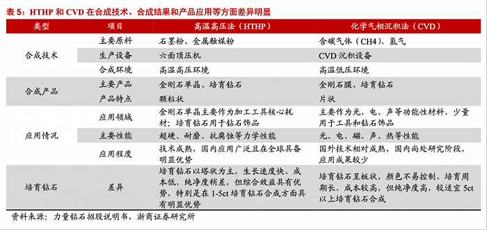 培育钻石有高温高压法(HTHP法)和化学气相沉积法(CVD法)两种生产技术。两种技术的差异主要表现在生长速度、净度、颜色工艺以及钻石颗粒上。浙商证券研报称,高温高压法主要以中小颗粒钻石为主,生长速度快,综合生产效益更高,但该法需要添加金属触媒,净度上有所欠缺;而CVD目前钻石生长速度慢、培育周期长,同时在颜色上,尤其是做到G色及以上(肉眼默认看到的白色)也是一大难点,但具备大颗粒优势,净度更高、更可控。
