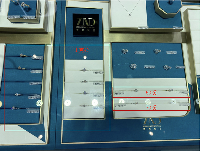 据郑州中南钻石体验店的销售人员介绍,该店销售的产品多以钻戒、项链为主,颜色主要是DE色,净度以VVS、VS为主,相比天然钻石,培育钻石的净度更高、颜色更亮,但价格却便宜不少,例如店里销售的1克拉钻戒,价格普遍在3万元以上,是天然钻石价格的1/3,甚至1/5。