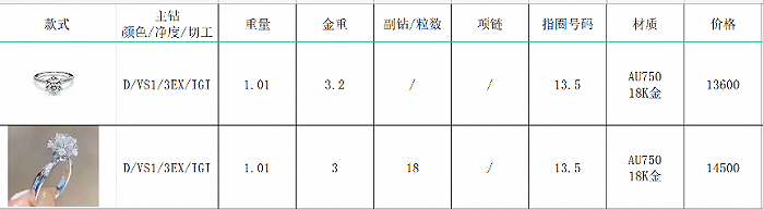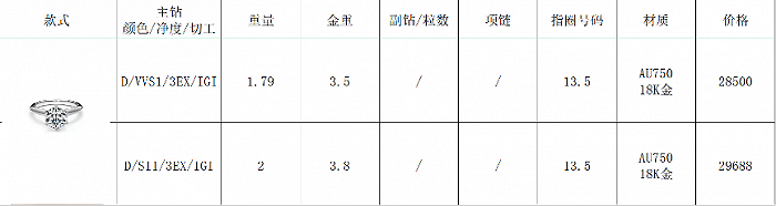 黄河旋风培育钻石销售业务的一位人士告诉界面新闻,目前公司的钻戒、项链等主要通过内部销售给消费者,定制工期在7-10个工作日,由工厂直接发货。其中D色、净度VS1、1克拉的钻戒价格在1.3万元-1.5万元左右,3万元则可以买到VVS净度、1.79克拉或者SI净度、2克拉的钻戒。