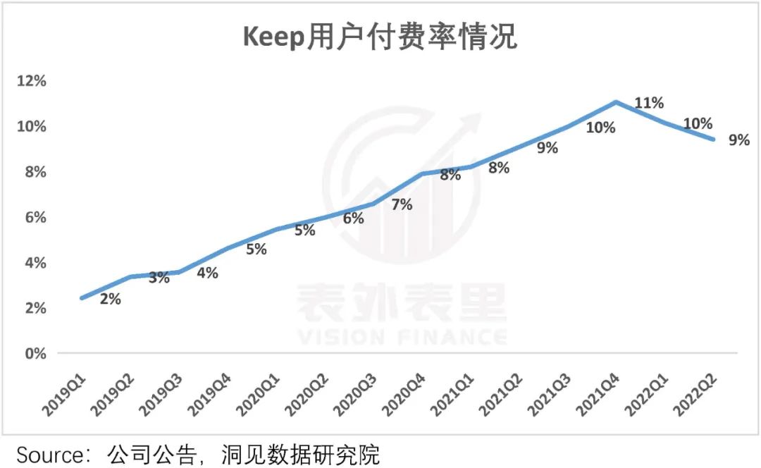 这在数据上反馈上也有体现,如下图,2019Q1开始,Keep的付费率不断攀升,2022Q2为9%。