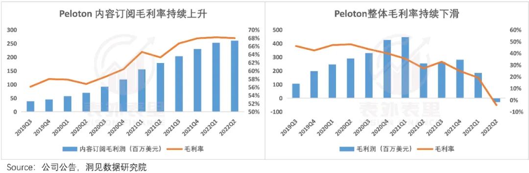 不过,上述说过Peloton硬件售卖只是流量入口,平台营收关键还是内容订阅——2022Q2,订阅收入占比达到56%。且内容订阅业务的毛利率在持续上升,2022Q2已达到68%。
