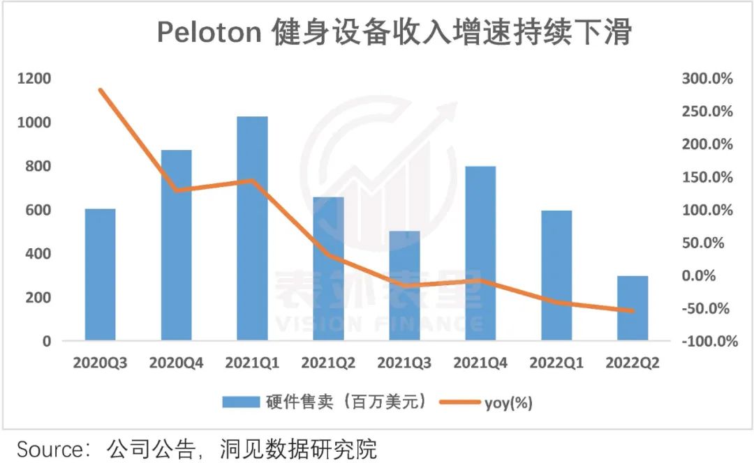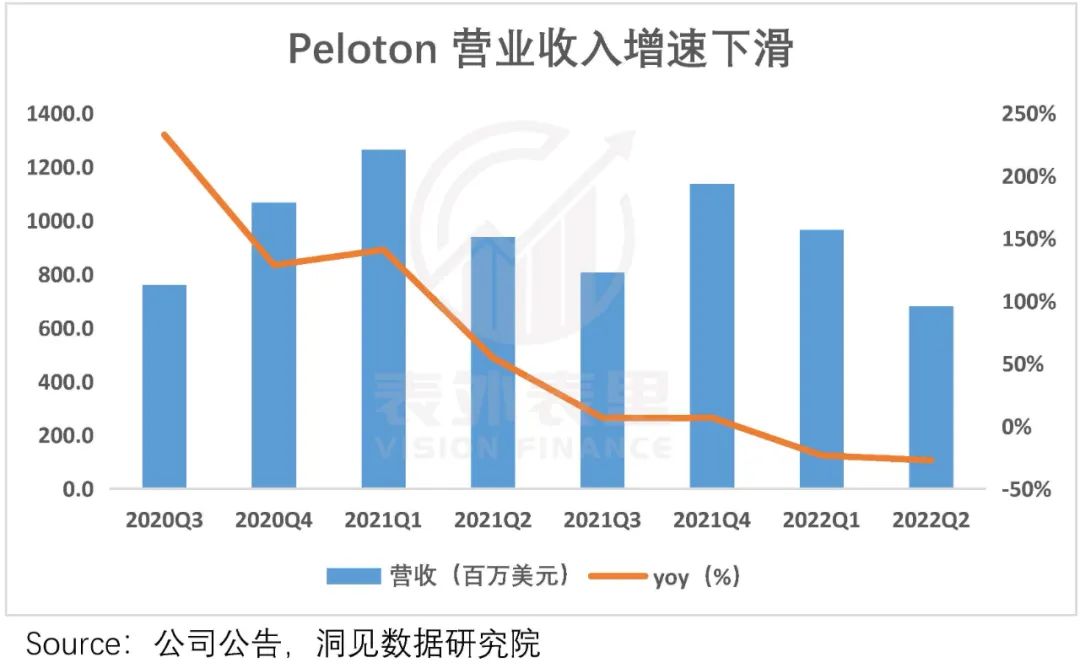 但这一常识,似乎在Peloton身上失效。可以看到,其营业收入增速在2021Q2之后持续大幅下滑。