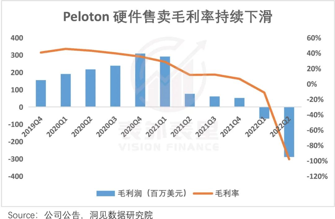 受此影响,2021Q2开始,Peloton的硬件售卖业务毛利率大幅下滑。