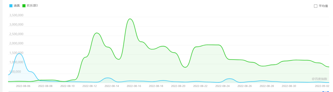 以迪奥的百度热度数据为例。在《欢乐颂3》8月11日开播后,其热度在8月13日迎来了第一波小峰值,而在剧集即将结束的8月25日,迎来第二波峰值。