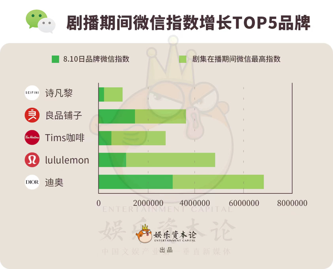 从剧播期间,不同品牌舆情指数的最高增长数据来看,播出期间,迪奥、lululemon、Tims咖啡、良品铺子及诗凡黎的微信热度提升最高。迪奥、元气森林、良品铺子、21金维他及lululemon的微博热度提升比较明显。
