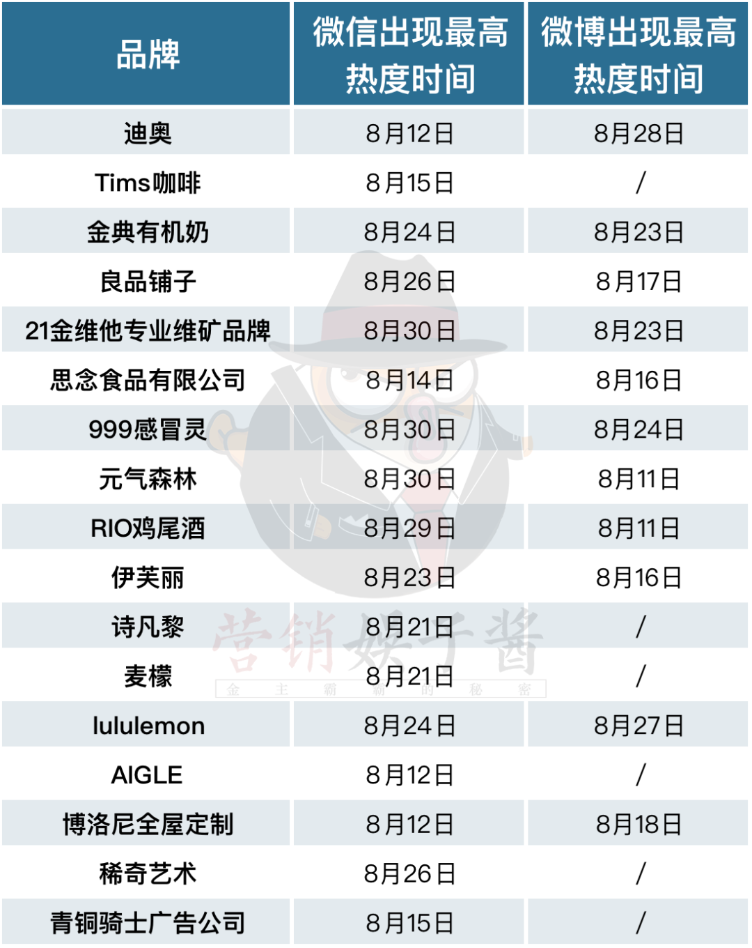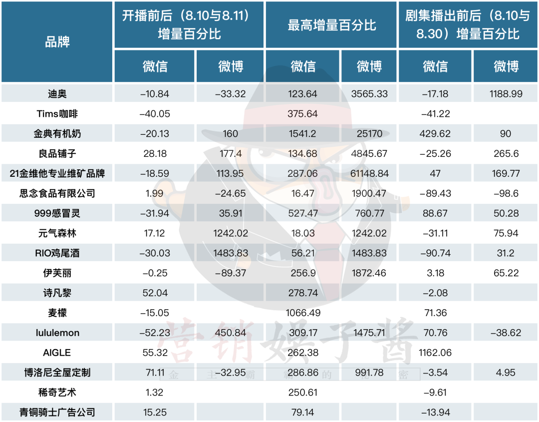 娱乐资本论重点关注了商务鸣谢名单中17个品牌在开播前(8.10)、开播第一天(8.11)、及剧集结束后的第一天(8.30)的微信指数与微博指数数据,并统计了剧播期间,品牌热度最高的相关指数,具体数据如下表所示: