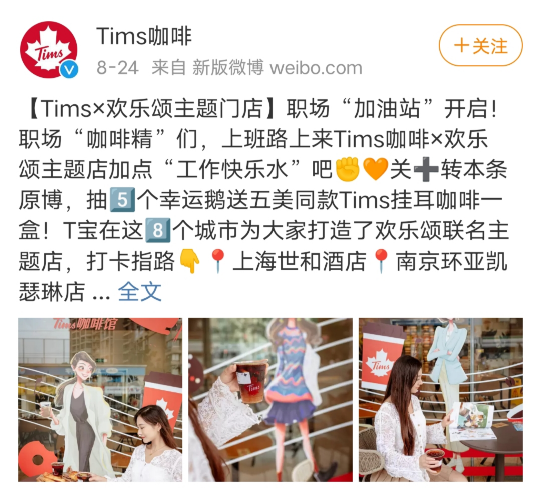 更重要的是,剧播期间它还推出了欢乐颂IP联名的“咖啡加油站”包装、贴纸、杯垫、口罩等周边产品。并且在8家欢乐颂IP主题店,推出了“消费满30元,带话题#Tims职场咖啡精 发帖到小红书,可以领取咖啡精时髦工牌”的营销活动。