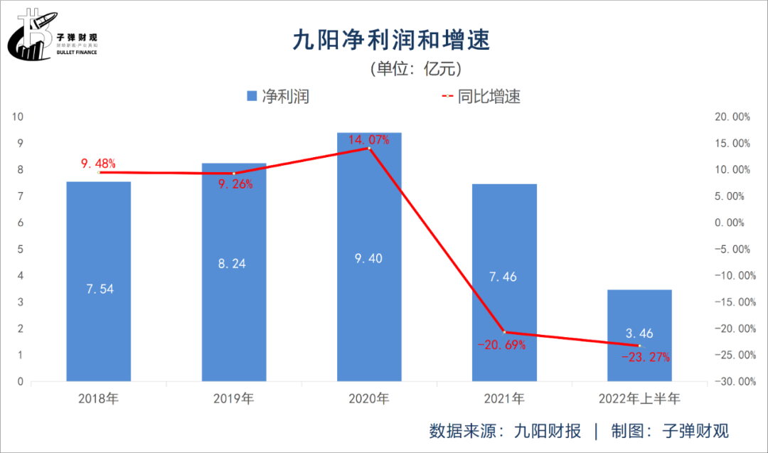 财报显示,2022年上半年九阳的净利润为3.46亿元,较上年同期的4.51亿元下滑23.27%。