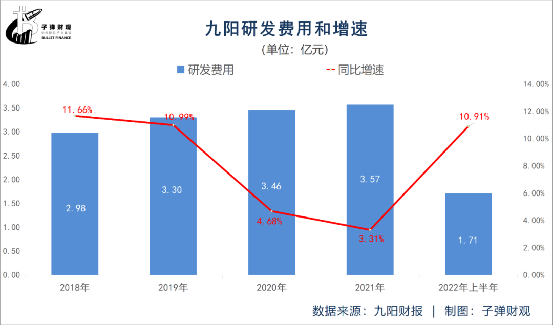 当然,上涨的不止九阳的管理费用,也包括其研发费用。根据九阳往期财报,2022年上半年该公司的研发费用为1.71亿元,较上年同期的1.54亿元增长10.91%。