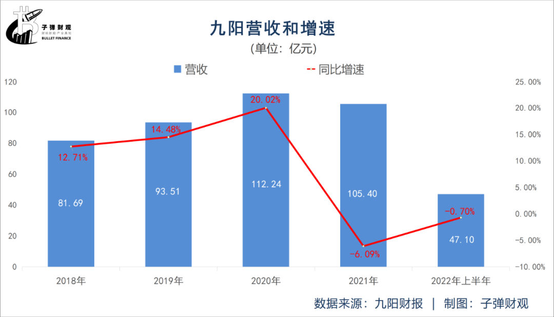 先看营收。根据已公开的财报,2022年上半年九阳的营收为47.10亿元,较上年同期的47.44亿元下降0.70%。