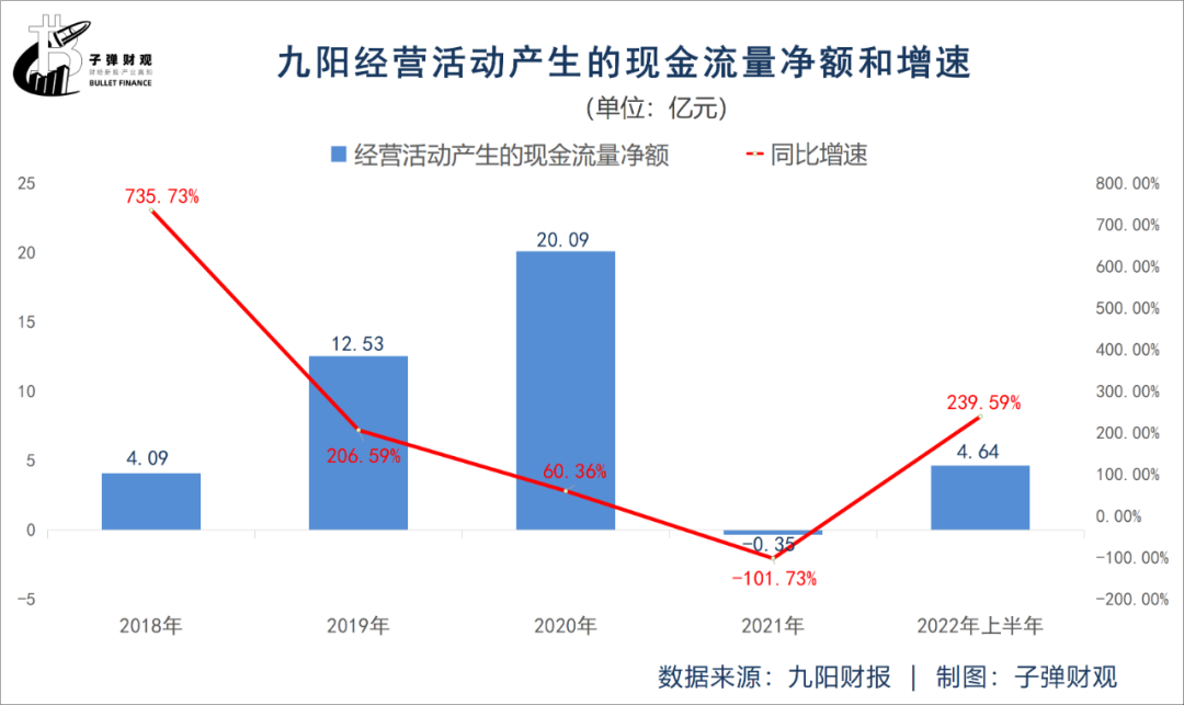 从客观层面来说,该公司的表现还是有可圈可点之处。就拿现金流来说,最新财报显示,2022年上半年九阳经营活动产生的现金流量净额为4.64亿元,较上年同期的-3.32亿元增长239.59%。