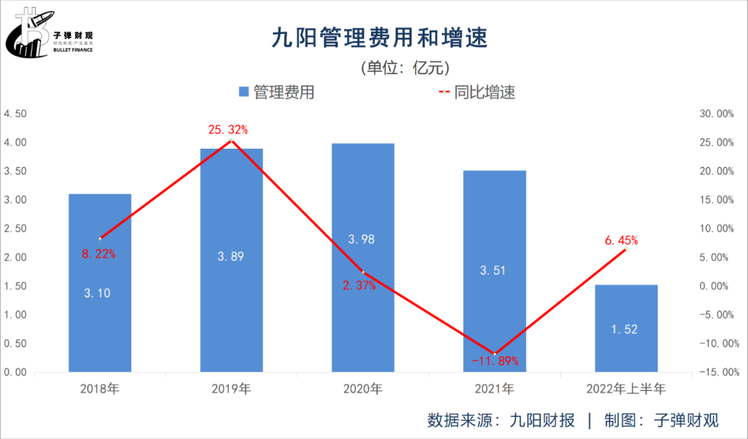 再看成本。九阳的管理费用正上涨。据九阳此前发布的财报显示,2022年上半年该公司的管理费用为1.52亿元,较上年同期的1.43亿元提升6.45%。