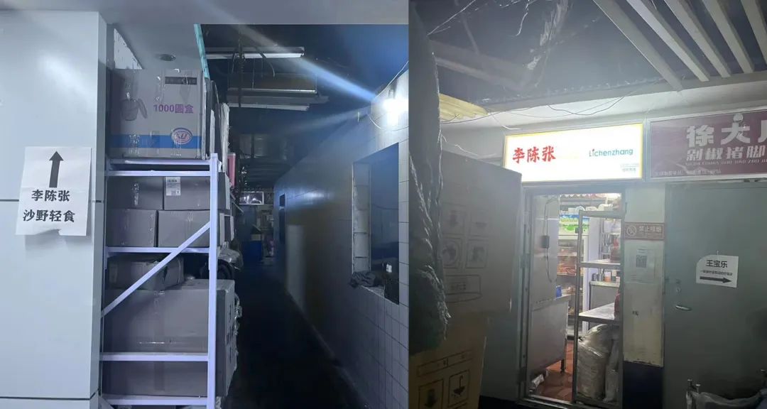 李陈张就开在这家美食城的暗厨中,在过道的墙上简单粗暴的贴着一张A4纸,引导前来取餐的外卖员穿过堆放着纸箱包材的货架,找到出餐口。