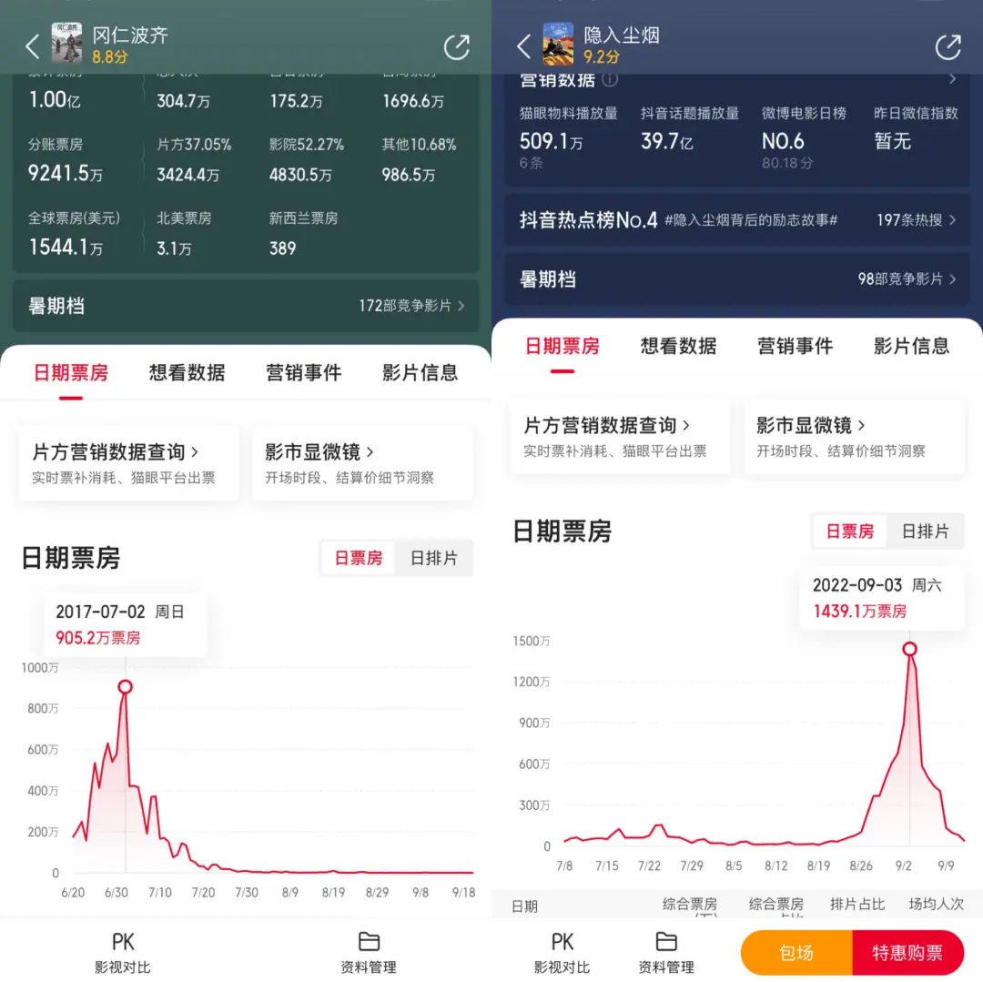 图/《冈仁波齐》与《隐入尘烟》票房走势 来源/猫眼专业版 燃次元截图