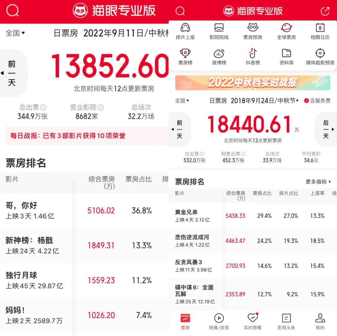 图/2022年、2018年中秋档电影日排名前四票房占比对比 来源/猫眼专业版 燃次元截图