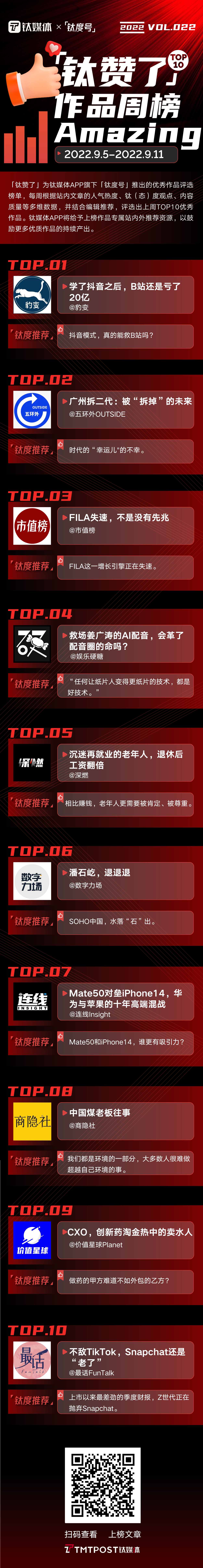 2022年9月5日—9月11日,「钛赞了」榜单第22期上榜作品为: