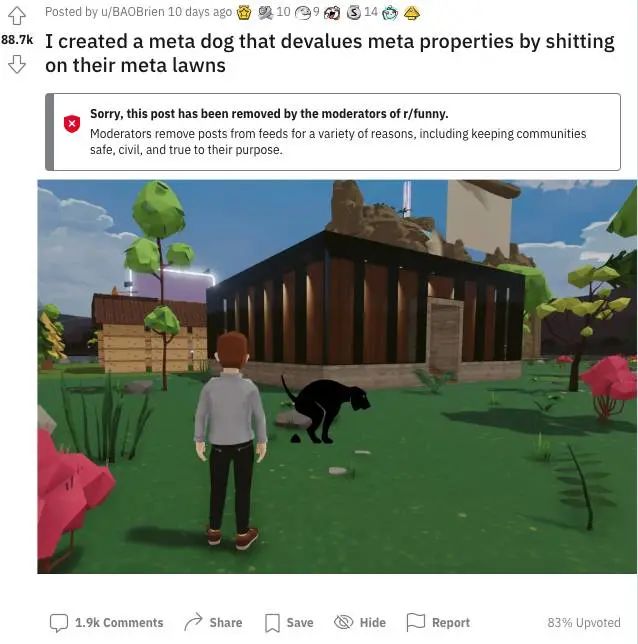 恨到这个地步,说明真不能忍,所以已经使出了最让人忍不住的屎尿屁攻击。而在元宇宙里,也有人使出了相同的攻击手段(行为艺术)——拉屎。Reddit 有一个叫作 @u/BAOBrien 的用户发布帖子称,他创造了一只元宇宙狗狗,这只狗会在元宇宙的世界里四处拉屎,以此来降低你所拥有的元宇宙资产价值。