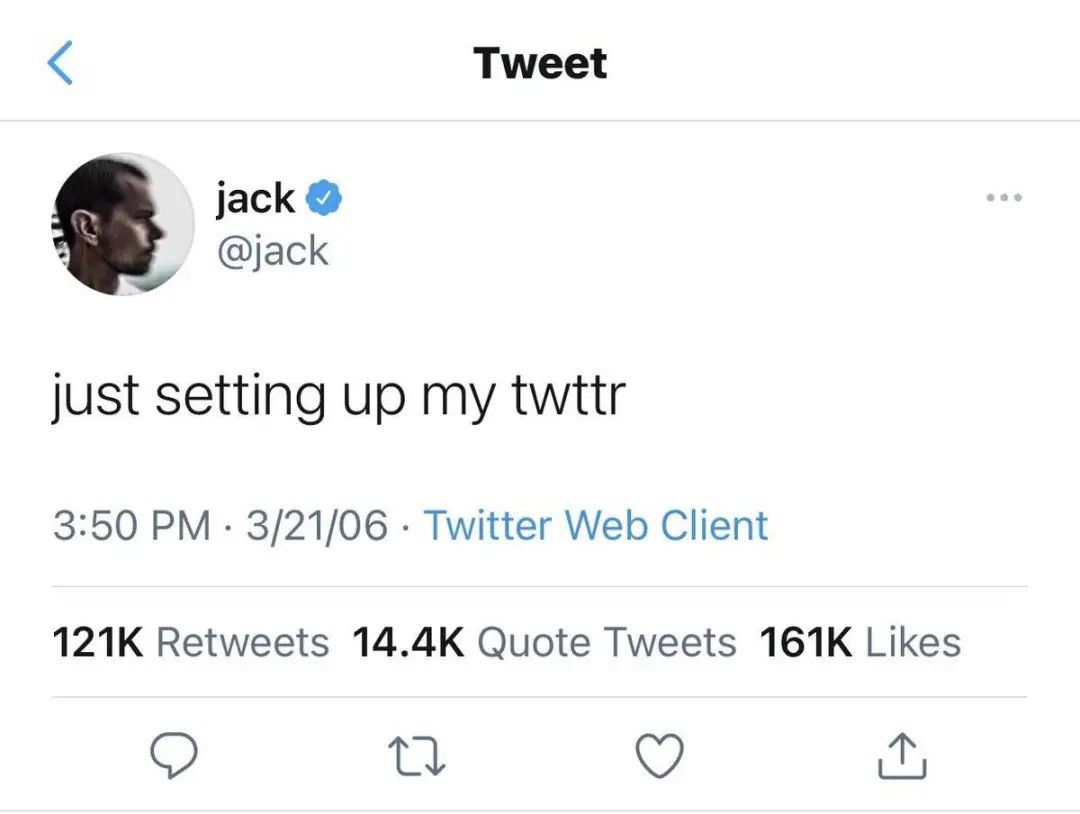 去年购买推特创始人 Jack Dorsey 发出第一条推特「just setting up my twttr」NFT 的加密货币创业者 Sinai Estavi 就成了最后一个笨蛋。