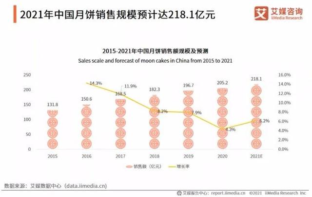 根据艾媒咨询发布的《2021年中国月饼市场与消费趋势调查报告》显示,中国月饼销售额从2015年的131.8亿元攀升到2020年的205.2亿元,报告还预计2021年中国月饼销售规模将达218亿元,同比增长6.34%。但从图中可以看到,从2018年起,我国月饼销售额的增速就降低到了个位数,一直未能恢复。