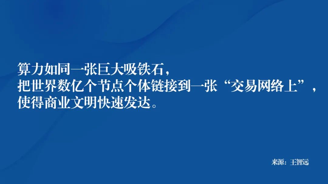 所以,算力基于计算器硬件设备,最大好处如同一张巨大吸铁石一样,把世界数亿个节点个体链接到一张“交易网络上”,使得商业文明快速发达。
