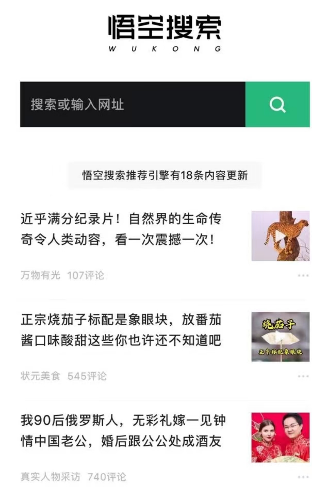 目前的悟空搜索就像是微信的“搜一搜”,属于平台附属功能,内容大都来源于头条、抖音、西瓜视频系,对第三方网站内容的抓取率非常低。 相比于同在搜索领域沉淀过了二十多年的百度相比,悟空搜索还有很长的路要走。