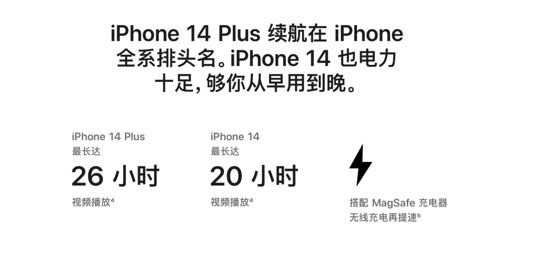 而且从苹果官方的描述来看,iPhone 14 Plus的续航在iPhone全系中排头名,毕竟在大电池、A15以及60Hz屏幕的加持下,续航不长那才叫奇怪。因此结合散热、续航以及重量的角度来看,iPhone 14 Plus其实算是一台真正的水桶机,只要价格合适,它的表现一定要比“毫无诚意”的iPhone 14强上不少。![]()