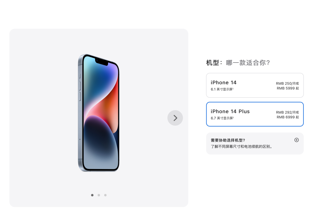 其次是它的配置方面,从官网中我们能够看到iPhone 14 Plus真的就是基于iPhone 14做了一丁点的改动,除了屏幕尺寸和电池方面几乎没有其他大的区别,就凭这两个升级点就要多卖一千块?相信大部分消费者哪怕是果粉也不会吃这个亏,事实证明大部分消费者是明智的,宁愿加1000元买Pro也不去买这台高不成低不就的产品。