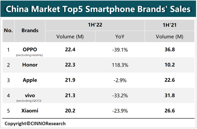 从各家厂商出货量的数据来看,除开不太具有对比价值的荣耀,今年上半年OPPO同比下降39.1%,vivo同比下降33.2%,小米同比下降23.9%。即便是苹果,同比也下降了2.9%,今年二季度财报首次出现利润和营收双跌的局面。