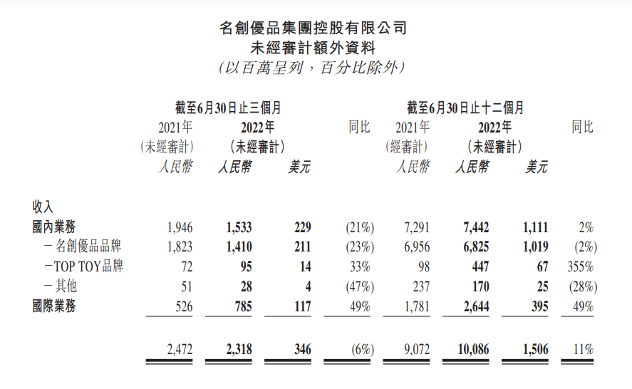 根据名创优品的财报显示,TOP TOY今年第一季度实现收入1.11亿元,同比增长377%,第二季度实现收入9500万元,同比增长33%,2022年上半年TOP TOY的总营收约为2.06亿元。