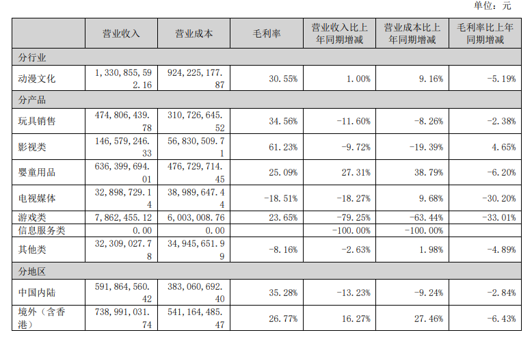 该公司的核心主营业务包括内容业务、玩具业务、婴童业务等类别,其中玩具销售业务实现营收4.75亿元,同比减少11.60%,婴童用品营收达到6.26亿元,同比增长27.31%。