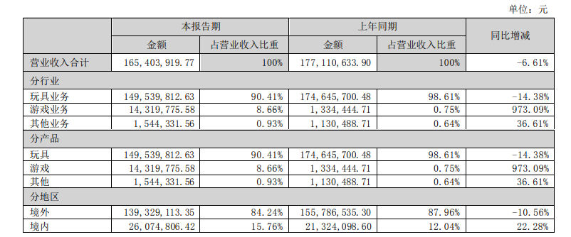 从营收构成来看,报告期内,公司玩具自产与玩具贸易业务占总营收的90.41%,是公司营收和利润的主要来源;分地区来看,境外占总营收的84.24%,境内占总营收的15.76%。