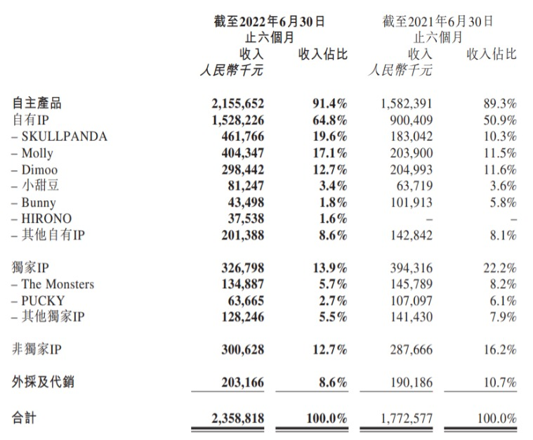 泡泡玛特的自主产品是其营收核心,占总营收的91.4%,按照IP划分包括自有IP、独家IP和非独家IP。