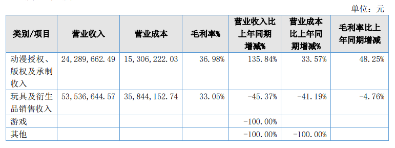 报告期内,玩具及衍生品销售收入占比最高,为5353.66万元,同比下降45.37%,动漫授权、版权及承制收入2428.97万元,同比增长135.84%。