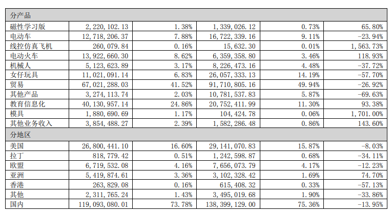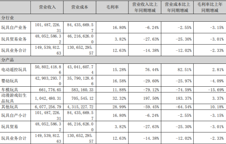 报告期内,玩具及相关业务营收1.19亿元,占公司总营收的73.45%,同比下降27.22%。分产品划分,模具销售收入达到188.07万元,同比增长1701.00%,主要是因为模具车间对外销售收入增加所致;机械人、女仔、其他产品及分地区中拉丁美洲、香港、其他等销售收入同比下降,主要是受国外疫情影响,订单减少所致。