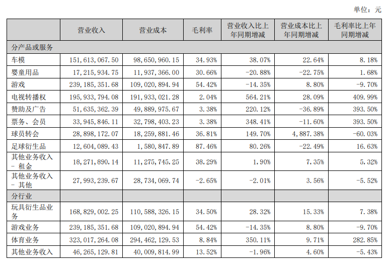 该公司的主要业务包括游戏业务、足球俱乐部业务、玩具业务。玩具业务方面主要专注于动态及静态车模、机器人、婴童玩具、积木拼装类玩具和户外骑行自行车等产品的研发、生产及销售。