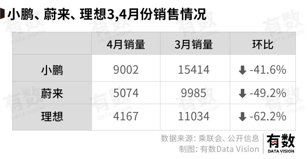 因此,供应链问题很快就传导到汽车交付量上。4月,小鹏,蔚来,理想交付量分别环比下降近40%,50%,60%。