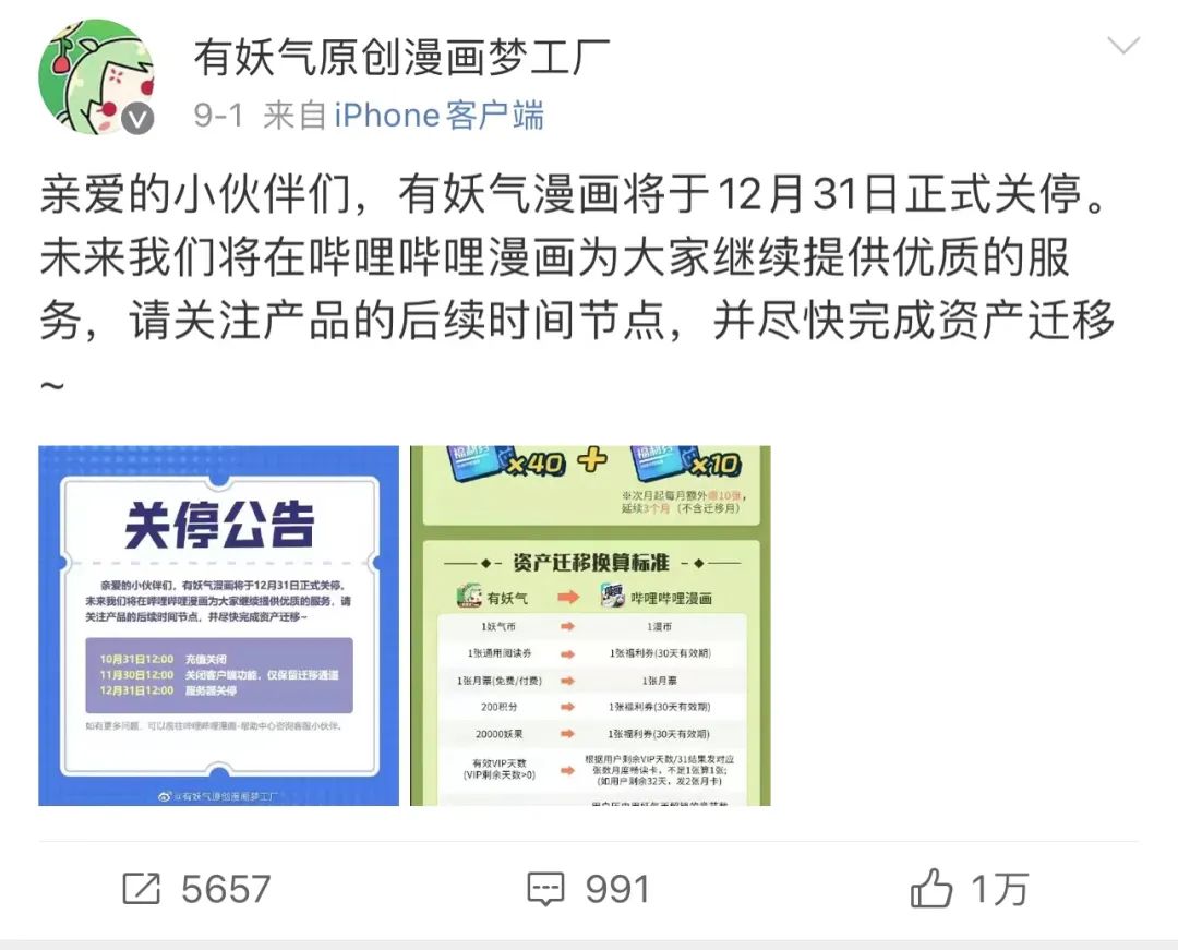 9月1日,有妖气原创漫画梦工厂账号发布公告,称平台将于今年12月31日正式关停,呼吁用户尽快完成资产迁移。未来有妖气漫画将在哔哩哔哩漫画提供服务——去年11月,B站花了6亿人民币全资收购有妖气漫画,从被收购到闭站,仅仅只经过了一年时间。