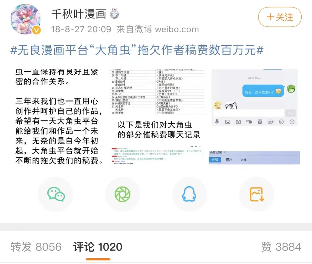 2018年的漫画平台大角虫欠薪事件就是一次集中爆发。当年8月,欠薪400万的大角虫漫画遭到近50名漫画作者的集体声讨,引发全网关注。网易漫画也在它原本计划上市的这一年,走完了它短暂的一生,像后来的有妖气一样卖给了B站。